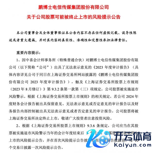 *ST 鹏博在公告中提到,因中喜管帐师事务所对公司出具了无法表暴露见的《2023 年度审计敷陈》,公司股票被履行退市风险警示。若公司 2024 年度财务管帐敷陈被出具保钟情见、无法表暴露见或含糊观点的审计敷陈以及财务敷陈里面抵制被出具无法表暴露见简略含糊观点的审计敷陈,公司股票将被上海证券交游所决定休止上市。