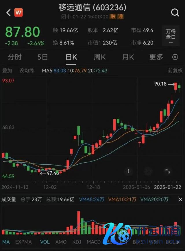 《逐日经济新闻》记者刺眼到,从 2024 岁首始,移远通讯的股价快速高潮,从最低 29.78 元 / 股高潮最高至 90.18 元 / 股,涨幅超 200%,总市值接近 230 亿元,成为成本阛阓存眷的"黑马"。2024 年 11 月底于今,移远通讯股价高潮接近 80%。