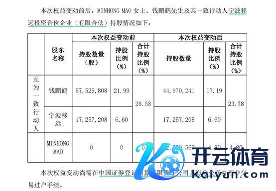 本次权力变动之前,钱鹏鹤过头一致行径东说念主宁波移远投资合资企业(有限合资)(以下简称宁波移远)系数握有移远通讯 7479 万股股份,系数握股比例为 28.58%。其中,钱鹏鹤握有移远通讯约 5753 万股,握股比例为 21.99%;宁波移远握有移远通讯股份约 1726 万股,握股比例为 6.60%。