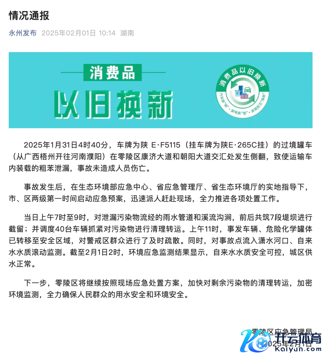 1月31日4时40分,车牌为陕 E·F5115(挂车牌为陕E·265C挂)的过境罐车(从广西梧州开往河南濮阳)在零陵区康济大路和向阳大路交织处发生侧翻,以至运载车内装载的粗苯露出,事故未变成东谈主员伤一火。