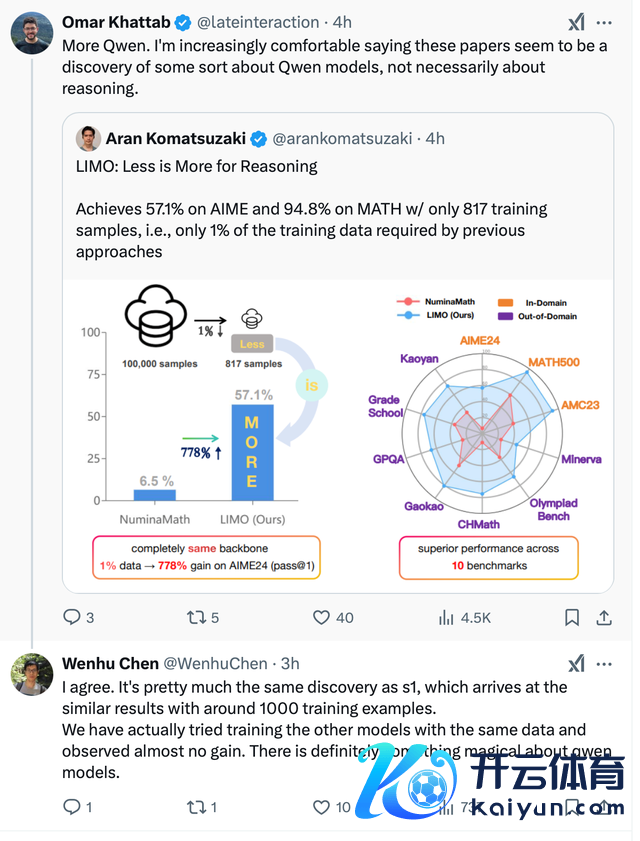 后生AI科学家、上海交通大学东说念主工智能学院谢伟迪副教会告诉《科创板日报》记者,要是仔细接续斯坦福s1的论文会发现,s1模子的神奇是以通义千问模子为基座进行微调,这1000个样本考试的作用更像是“镌脾琢肾”,而非“从零开动”。